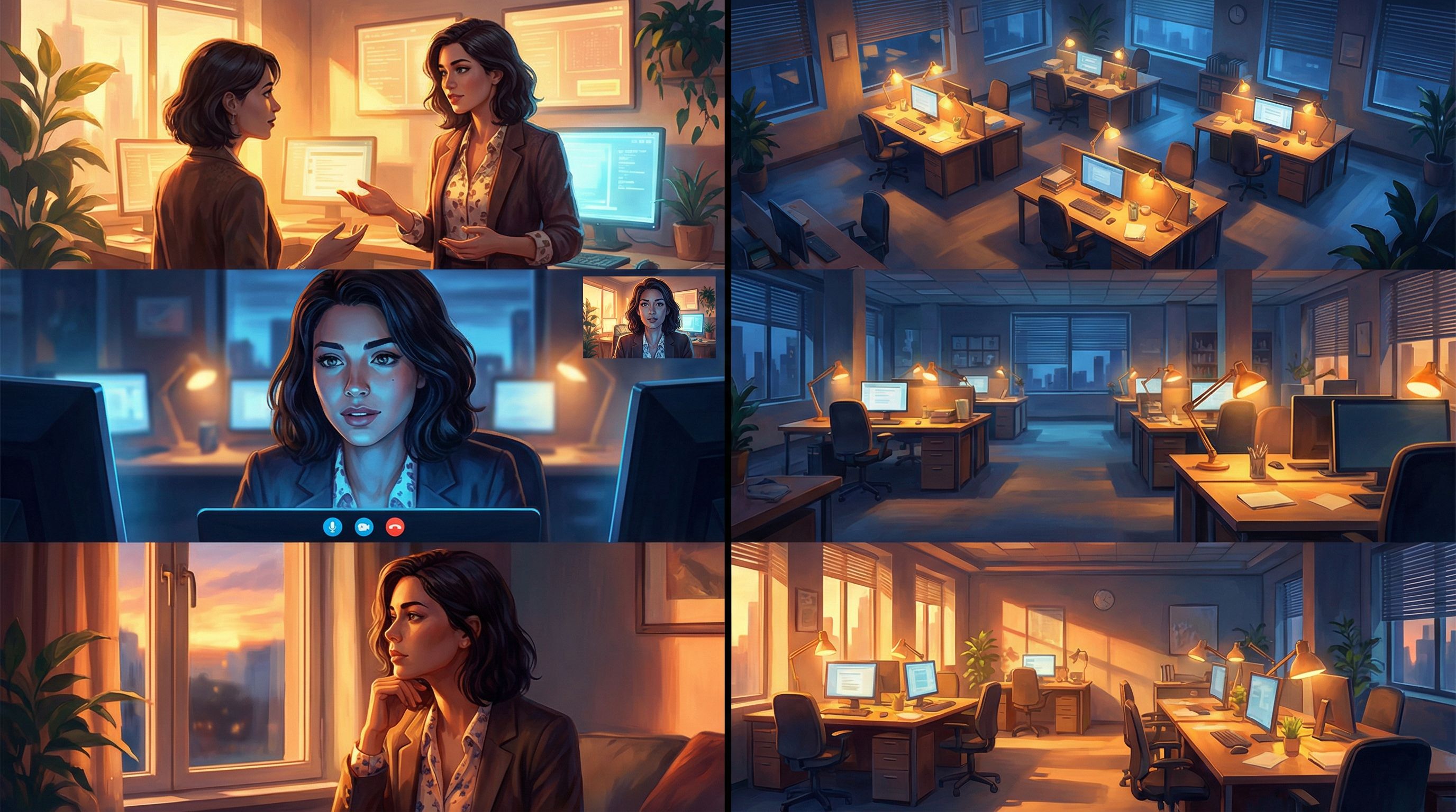 - Overall look: Semi-photorealistic, soft lighting, modern office interiors.