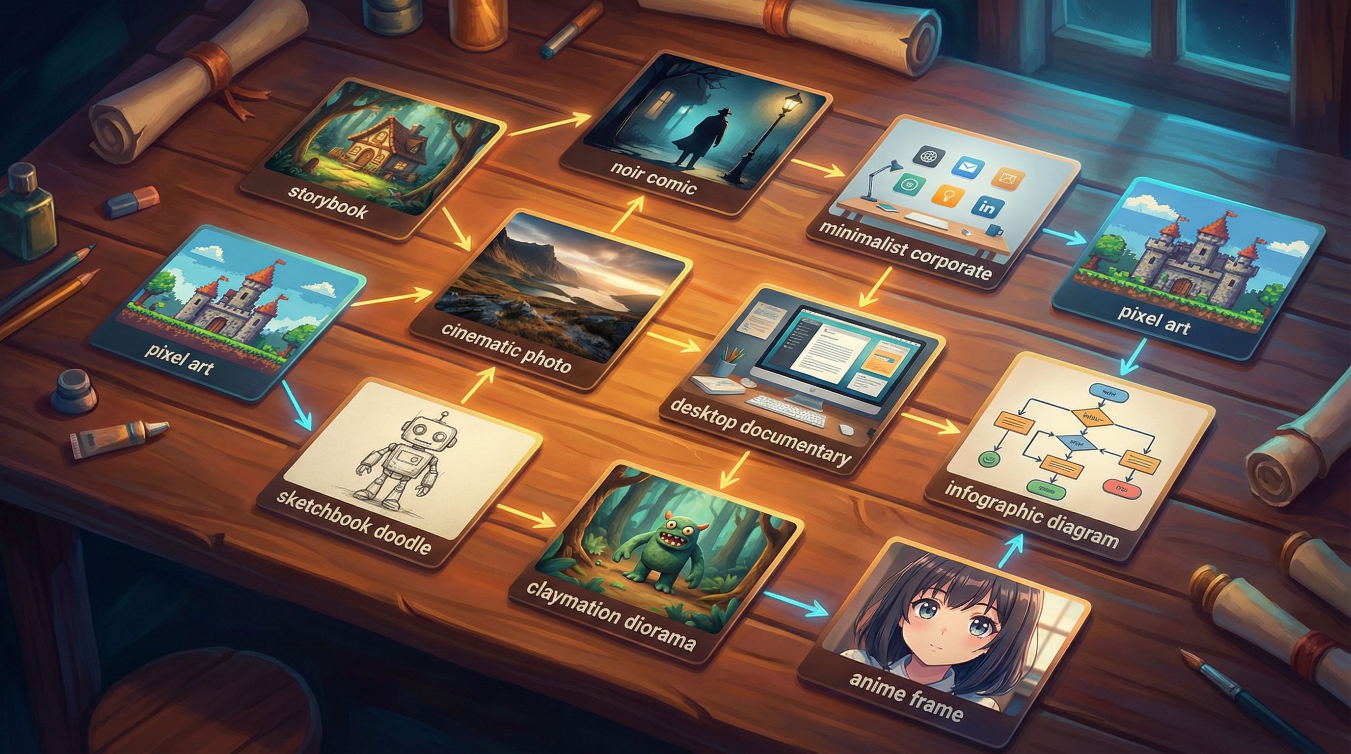 The ten cookbook styles in this guide—storybook, noir, minimalist corporate, pixel art, cinematic, desktop documentary, infographic, sketchbook, claymation, and anime—give you a starting palette. Combine them with a lightweight workflow (style seed → style bible → consistent prompts → playtest), and you’ll be shipping interactive visual stories long before you “learn to draw.”