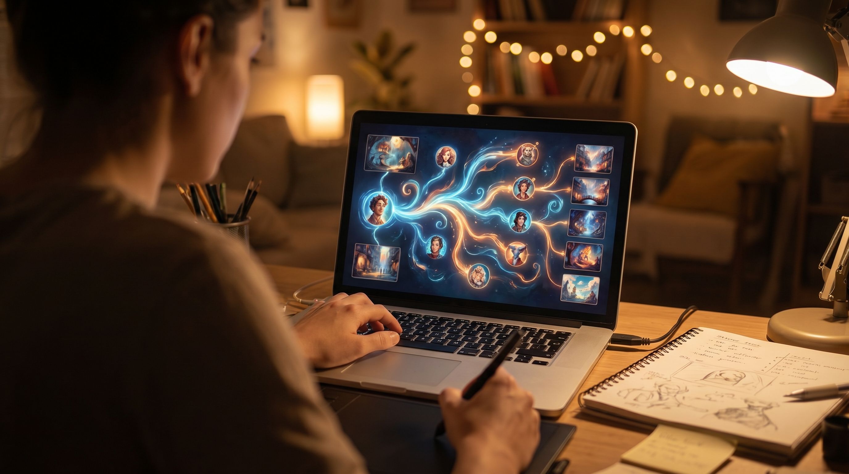 Using AI visuals as hooks. In Questas, you can render a striking image of a door, a skyline, or a character with a subtle anomaly (a glowing sigil, a mismatched shadow). That single visual can fuel three or four branches of curiosity.