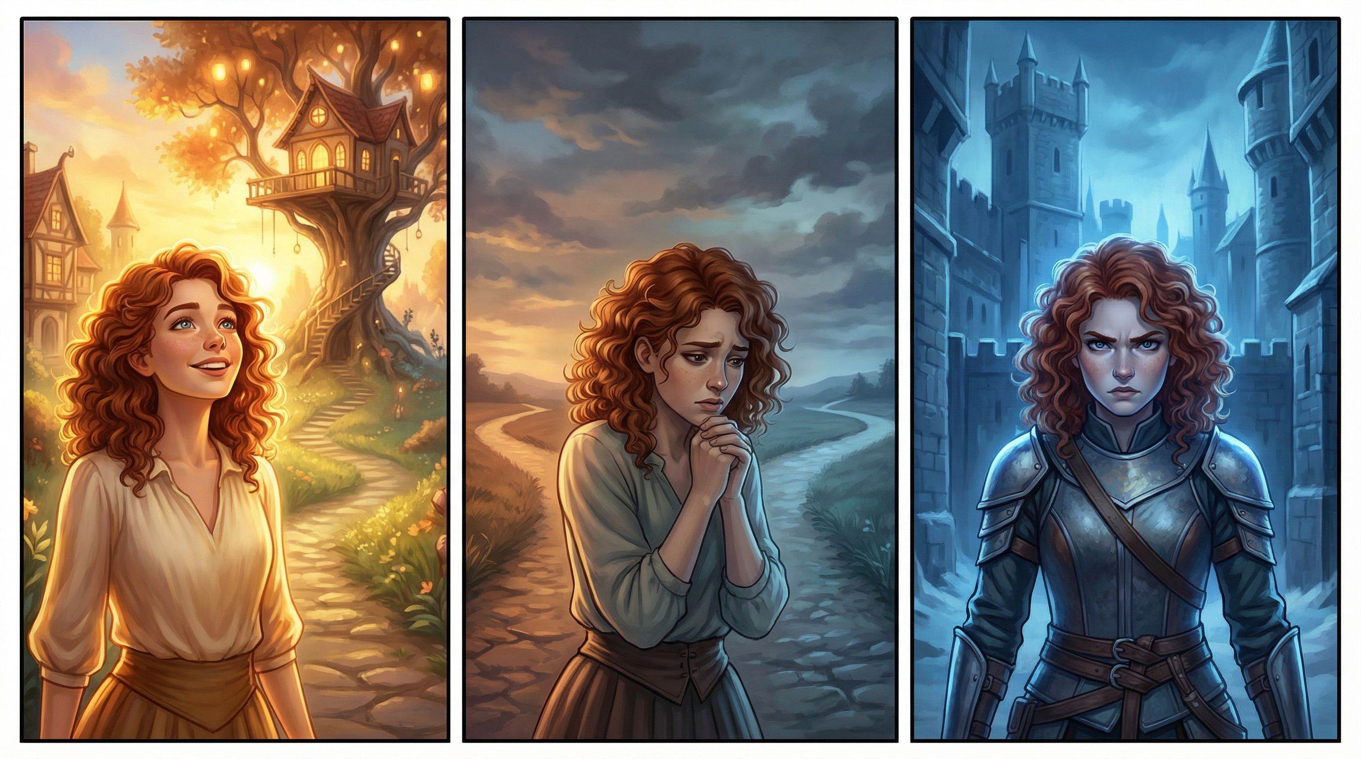 - Use AI images to show the same character or location changed by past decisions: damaged armor, a burned village, a character now avoiding eye contact.