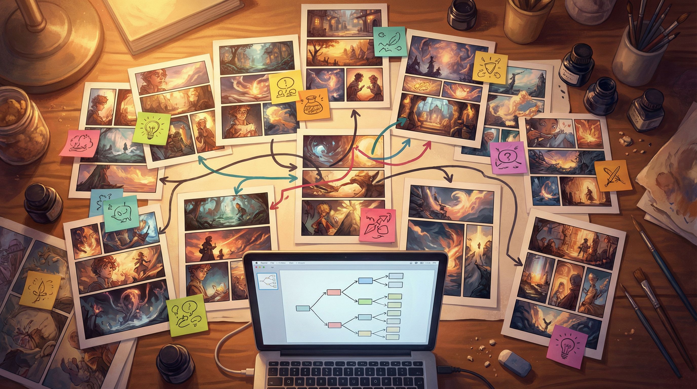 - Number panels, circle choice beats, draw arrows for branches, group into scenes.