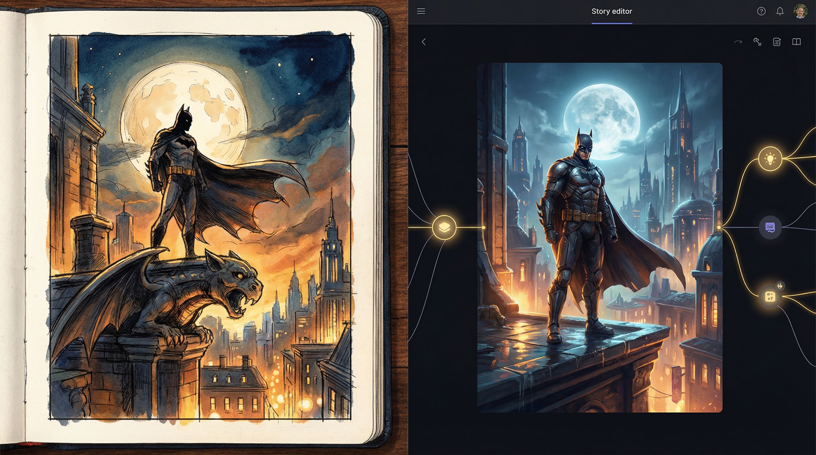 With Questas, you don’t need a custom engine or a dev team to make that leap. You can take the visual thinking you already use in comics, animatics, or pitch boards and turn it into a playable, choice-driven experience—complete with AI‑generated images and video—using a visual, no‑code editor.