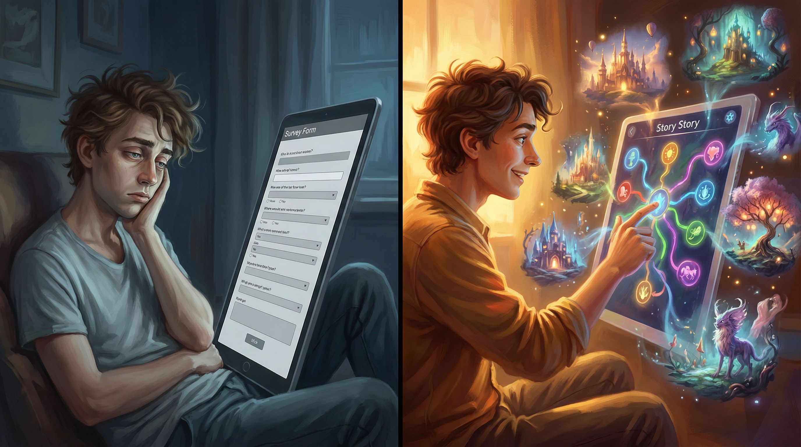 They’ll skip a 15‑minute questionnaire—but happily tap through a short, visual story where their choices shape what happens next.